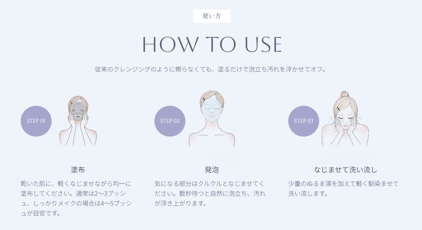 お肌になじませると自発的に泡立ち、メイクや余分な皮脂汚れを吸着しながら浮かせてやさしく包み込みます。